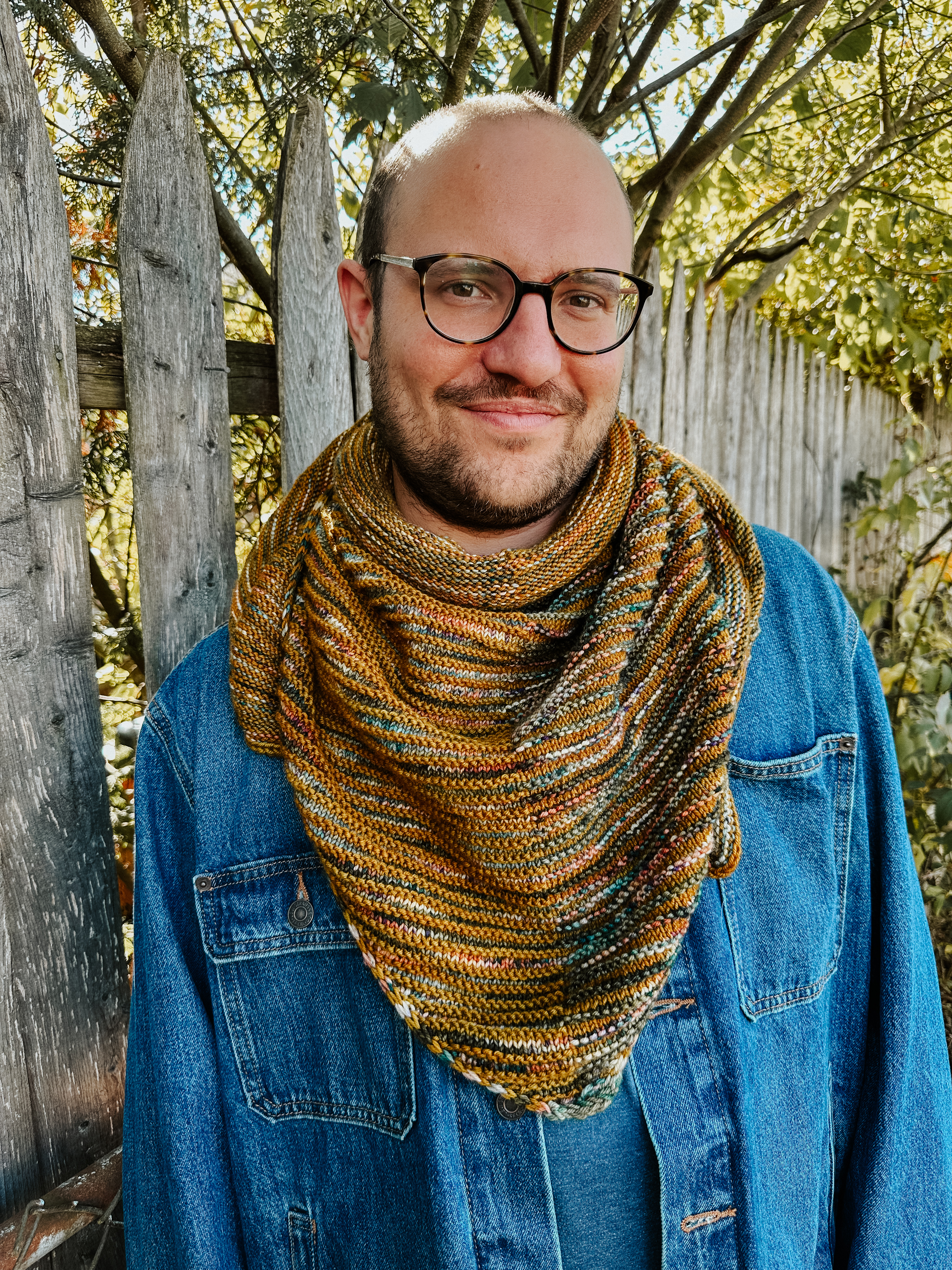 This shawl is designed with Hue Loco’s DK weight base, in 200g of a variegated (sample shown in ‘Changing Leaves’) and 200g of a rich semi-solid (sample shown in the colourway ‘Acorn’). Utilizing two unique, yet complimentary yarns is the key to this design, and I encourage you to have fun picking out a pair. The pattern utilizes US5, 3.75mm knitting needles. Despite it’s knit-flat construction style, I personally used my favorite pair of circulars to accommodate it’s lofty wingspan.