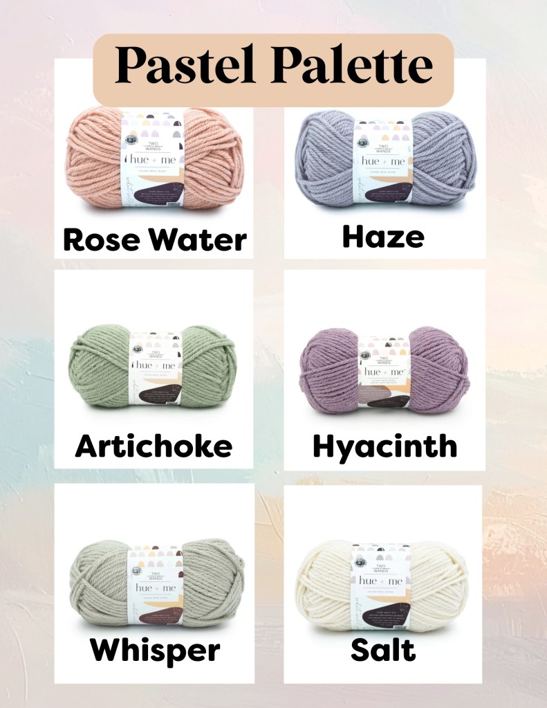 Love to daydream? I’ve got you covered. This pastel palette is everything we love about refracted rainbows and naps in the afternoon! It’s ethereal, gentle, and absolutely magical. Want an even more pastel vibe? Swap out your Artichoke colourway with additional skeins of Salt!