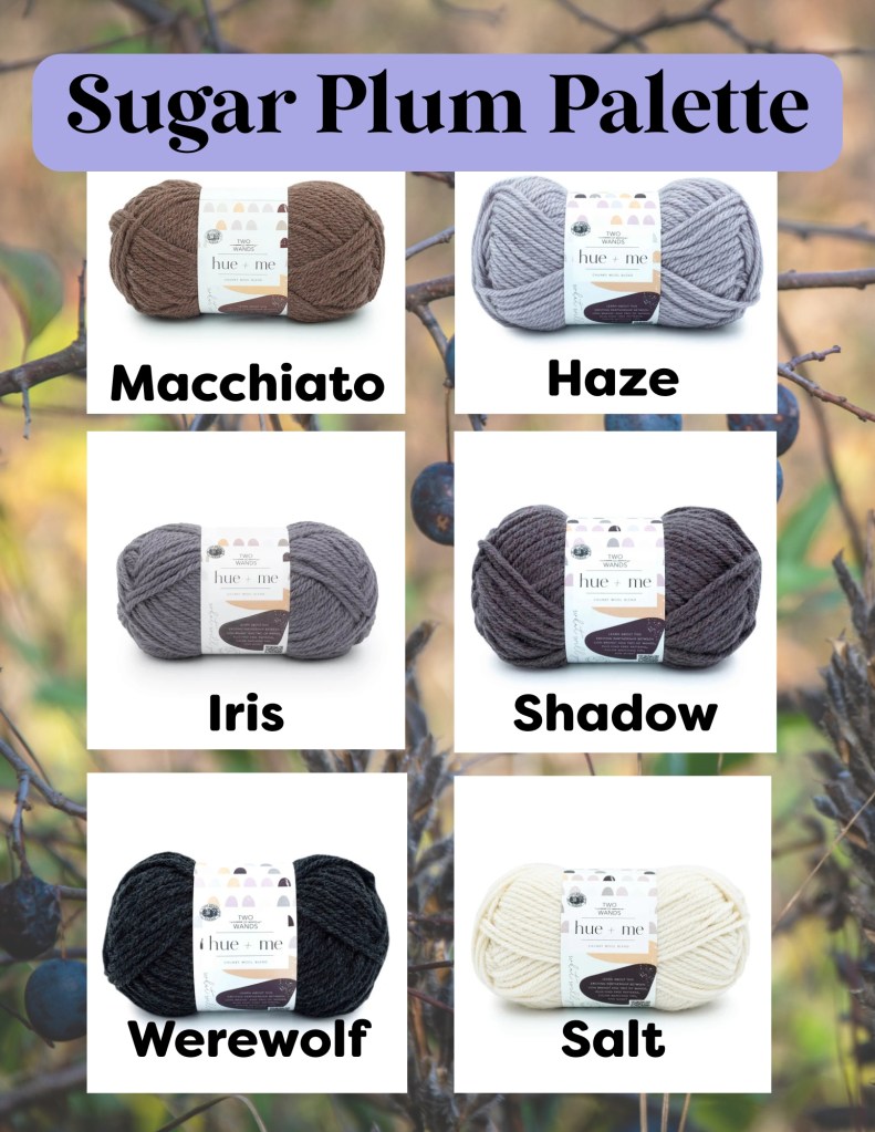 First up, we have the sample’s color palette: the Sugar Plum Palette! This was hand selected by the curator of Hue and Me yarn, Alexi Tavel (@twoofwands) and provides all the sensibility of a neutral option while sprinkling soft purple undertones in shades like Iris, Shadow, and Haze.